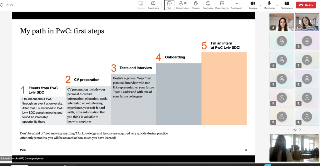 Під час заходу представники PwC Lviv SDC поділилися інформацією про можливості проходження оплачуваного стажування для студентів, які лише розпочинають свій професійний шлях і не мають попереднього досвіду роботи.