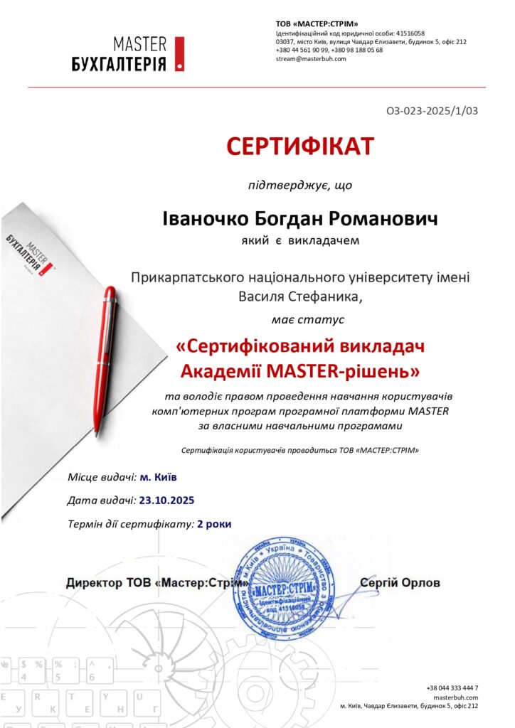 23.10.2025 асистент кафедри обліку і оподаткування Карпатського національного університету імені Василя Стефаника, доктор філософії з економіки, Іваночко Богдан Романович успішно пройшов навчання та отримав сертифікат викладача Академії MASTER-рішень, який дає можливість викладати за програмами з підвищення кваліфікації та професійного розвитку у сфері обліку і оподаткування.