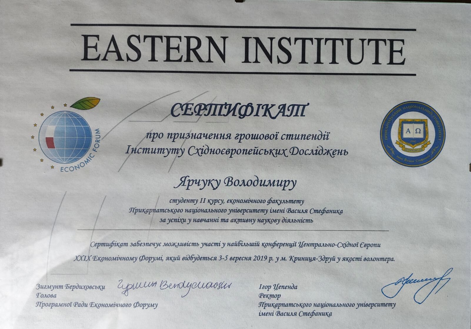 Призначення грошової стипендії від Фонду Інституту Східноєвропейських досліджень Ярчуку Володимиру студенту ІІ курсу спеціальності облік і оподаткування.